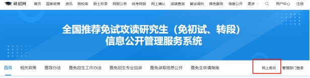 全国推荐免试攻读研究生(免初试、转段)信息公开管理服务系统(https://yz.chsi.com.cn/tm/),点击“网上报名”,注册学信网账号,注册成功后登录,进行填报。